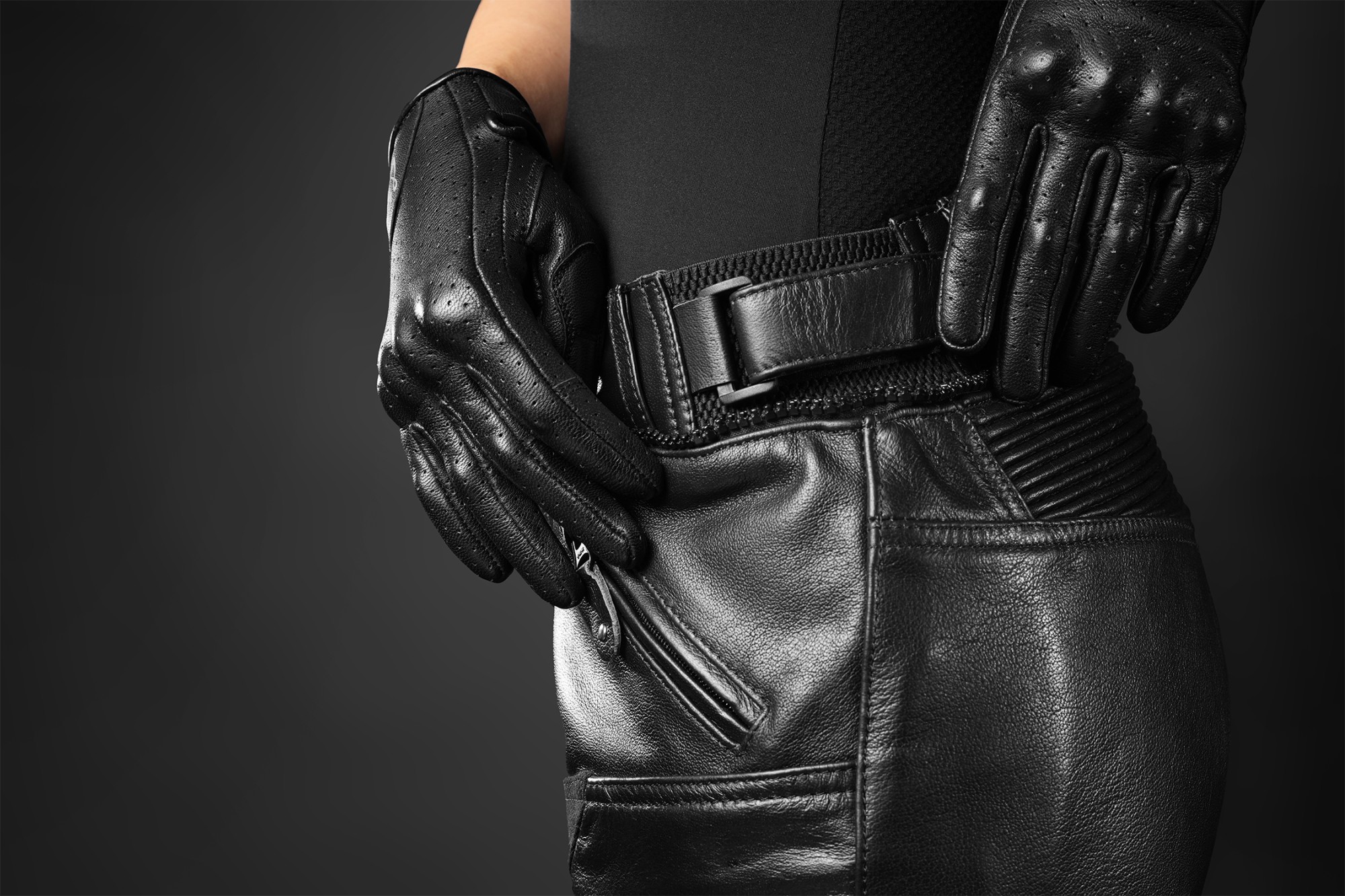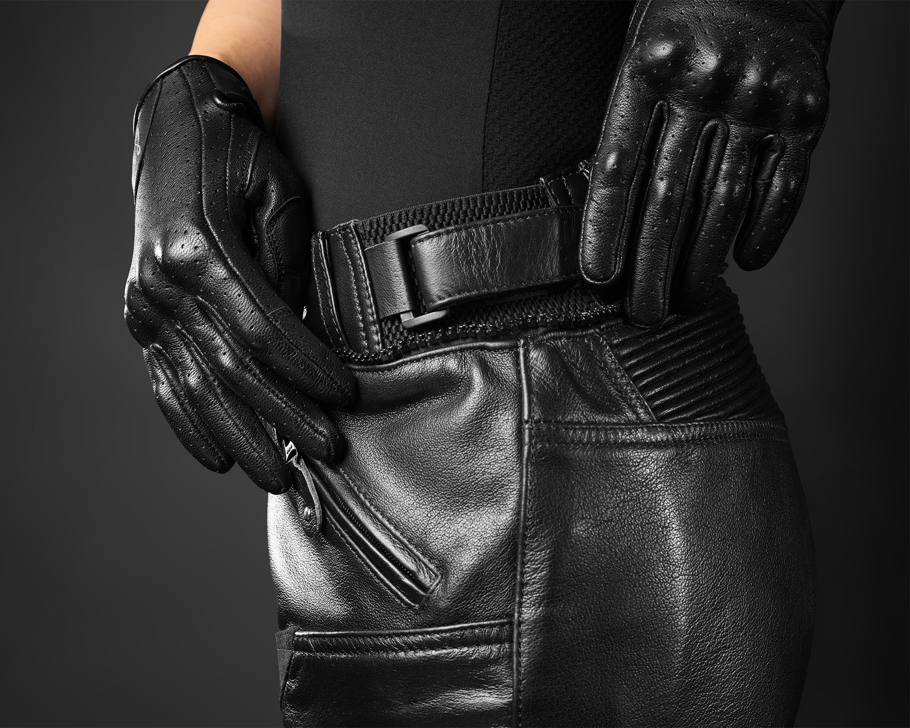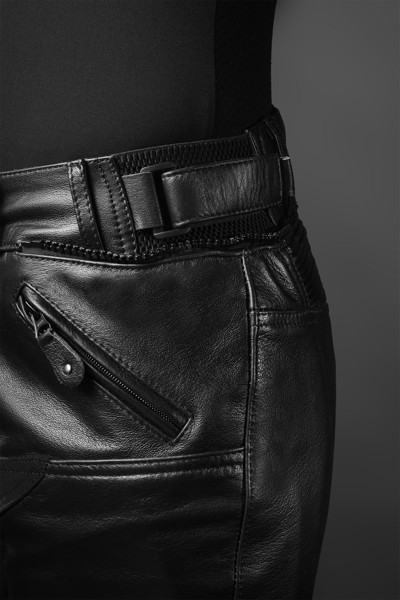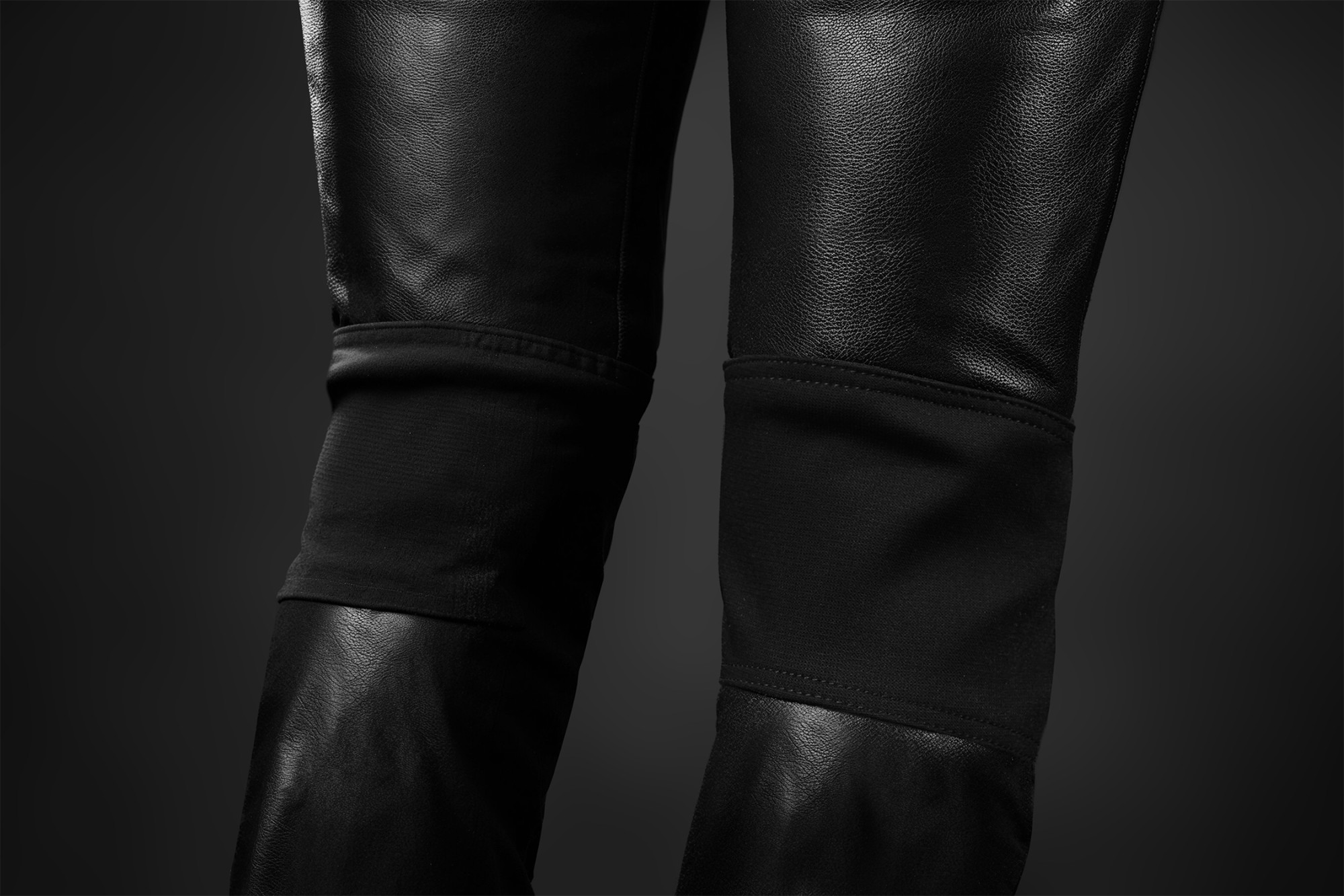 Patentované uchycení chráničů v kožených kalhotách.