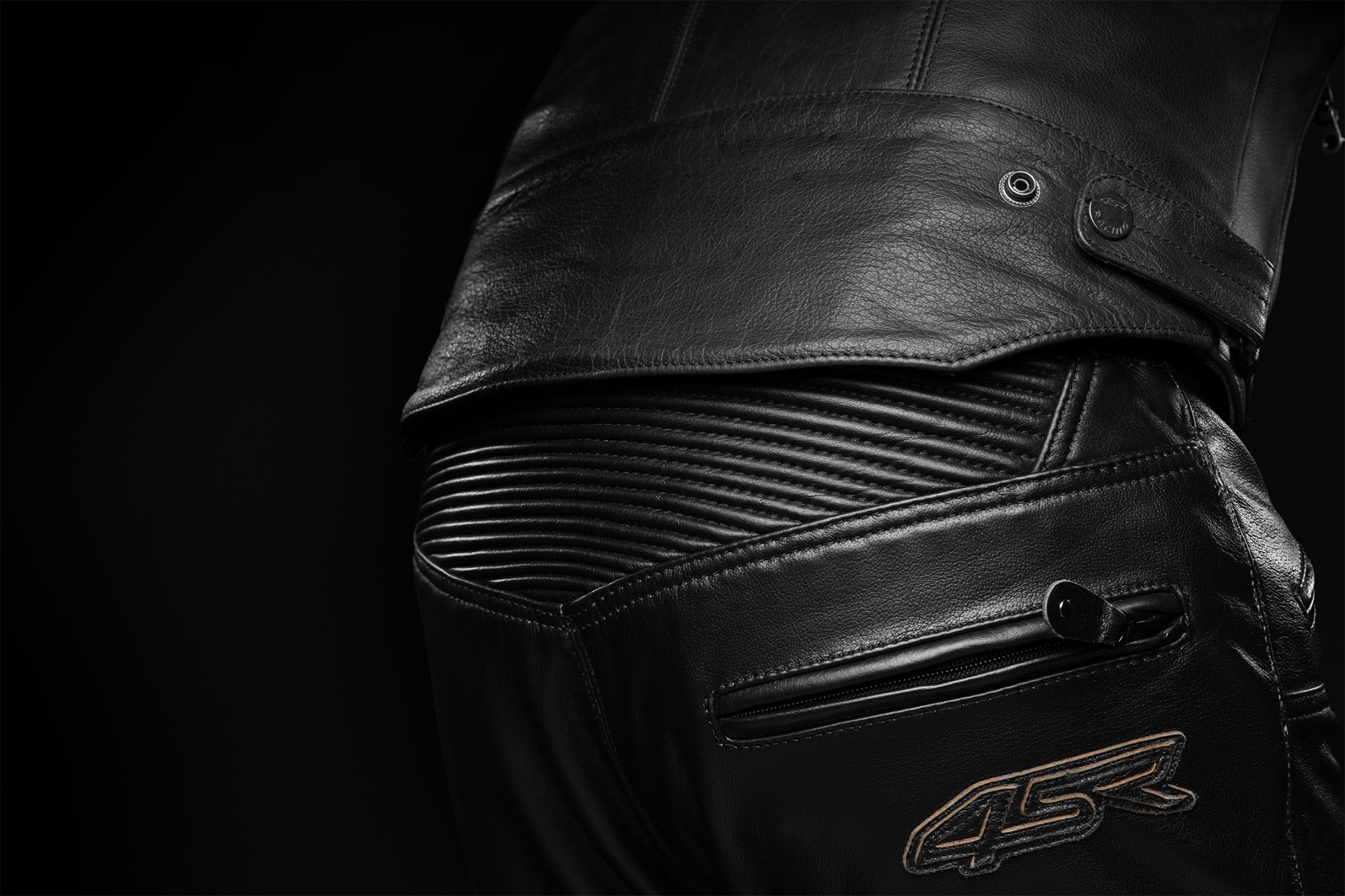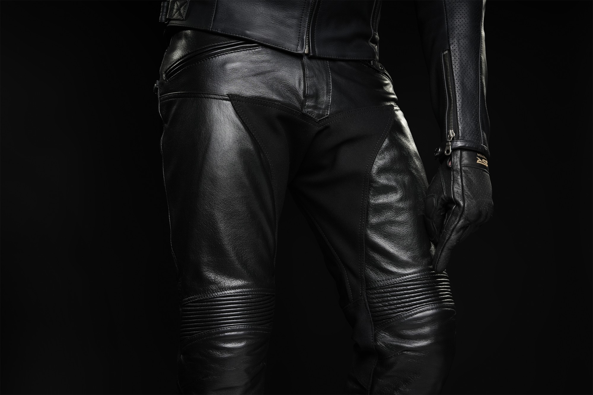 Patentované uchycení chráničů v kožených kalhotách.